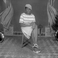 Young woman from Bangang, in white, sitting on a stool, legs crossed, hat tilted on her head, white sandals. Format of original: 59mm x 59mm plastic negative