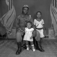 153. EAP054/1/158/424 Reference (shelfmark): EAP054/1/158/424 Title: Recreational photograph [c 1980] Scope & Content: Soldier sitting a small girl between his legs and a boy standing beside him Format of original: 59mm x 59mm plastic negative Collection Area: Endangered Archives Programme Languages: Not applicable Date Range: c 1980 Extent: 1 TIFF image