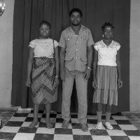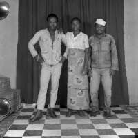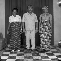 Three young women from Mbouda standing, the one on the left smiling broadly, handbag on left shoulder. Format of original: 59mm x 59mm plastic negative