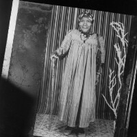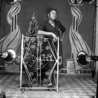 Woman standing behind an iron grillwork, right hand on grill, left hand on hip, plastic tree on her right. Format of original: 59mm x 59mm plastic negative