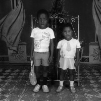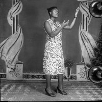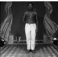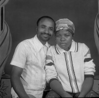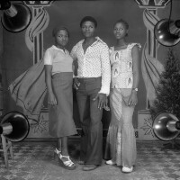 Three young people from Bamesso standing: Man flanked by 2 women, he in white shirt, dark trousers and shoes, the women in pale clothes and white shoes, one in a skirt and the other in full-length skirt. Format of original: 59mm x 59mm plastic negative