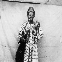 15. EAP054/1/57/49 Reference (shelfmark): EAP054/1/57/49 Title: Recreational photograph [c 1988] Scope & Content: Man from Bamesso in traditional dress, pipe in mouth, horse tail fly whisk in his right hand, sheep horn in his left hand. Format of original: 59mm x 59mm plastic negative Collection Area: Endangered Archives Programme Languages: Not applicable Date Range: c 1988 Extent: 1 TIFF image