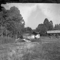Four young men from Bangang standing, one in dark suit, one with face obscured, behind iron grillwork. Format of original: 59mm x 59mm plastic negative