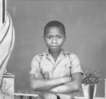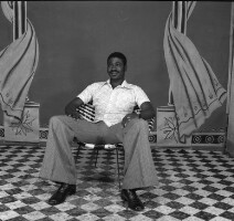 Man from Mbouda sitting, leaning back, hands on thighs, feet apart, white short-sleeved shirt, grey trousers, black shoes. Format of original: 56mm x 59mm plastic negative
