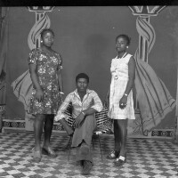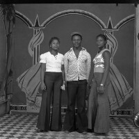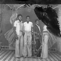 3 young people from Bati, young man sitting on armchair, between 2 young women standing, one girl in white dress. Format of original: 59mm x 59mm plastic negative