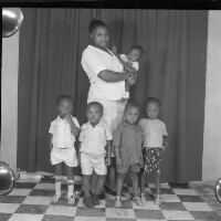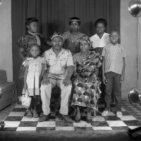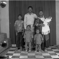 Family of seven people: man and his first wife sitting on stools, his second wife standing behind with four children (3 girls and a boy). Format of original: 59mm x 59mm plastic negative