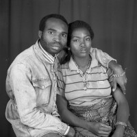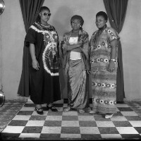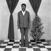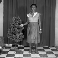 Man from Mbouda standing in dark suit, between 2 tied back curtains, plastic tree in front of left curtain. Format of original: 59mm x 59mm plastic negative