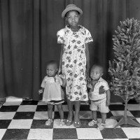 Young woman in floral dress and wide rimmed hat, holding the hands of 2 younger children, probably twins, plastic tree on her left. Format of original: 59mm x 59mm plastic negative