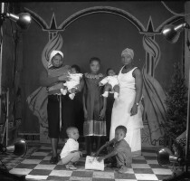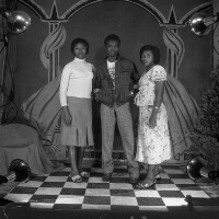 Women from Mbouda standing, holding a loop of rope in both hands, in dark patterned dress, white shoes. Format of original: 59mm x 59mm plastic negative