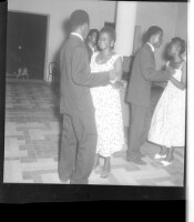 - A man wearing a suit holding the hand of a woman standing in profile in a room with a crowd.