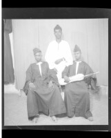Three men in the studio, all wearing boubous; two sitting in front, one of whom has a traditional guitar another standing in back