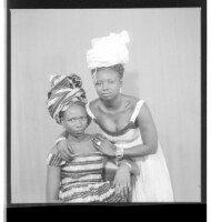 Two women in the studio; one standing with her hands on the other's shoulders and wearing all white, the other sitting (same women from Image 03887)