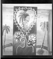 A young woman standing behind a heart-shaped frame in the studio and in front of a painted backdrop (same woman from Image 03959)