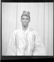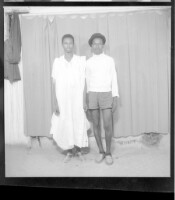 Two young men standing in the studio; one wearing a white boubou, the other wearing shorts, a white shirt, and a black hat
