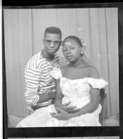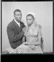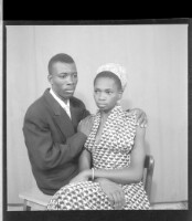 A couple in the studio; the young woman sitting and wearing a dress and a bracelet, the young man sitting and wearing a white shirt and a black jacket (same couple from Image 04007)
