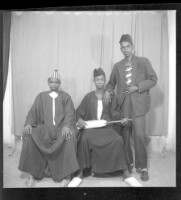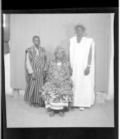 Three people in the studio; two men standing, on in a striped boubou, the other wearing a white boubou, and a woman sitting in the middle