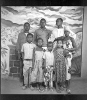 Three men, one wearing a boubou, and a woman standing behind two boys and two girls standing face-forward in front in the studio.