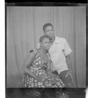A woman wearing a dress and head wrap sitting face-forward holding a child, next to a boy and a girl in the studio.
