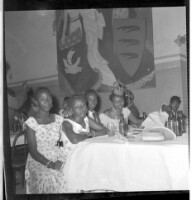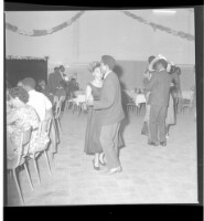Two couples dancing in the foreground of a party: a young woman standing wearing a black dress with a young man wearing a black suit, with another behind and six people sitting and two standing.