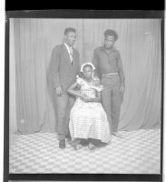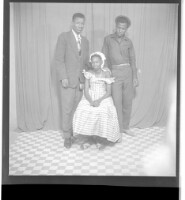 A woman wearing a dress, head wrap, and necklace sitting in profile in between two men, one wearing a shirt, pants, and hat standing face-forward and the other wearing a suit and tie standing in profile in the studio.