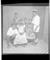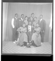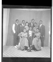 A family photo of 9 people: a man sitting face-forward in between two women sitting, one face-forward and the other in profile, in front of 6 people standing, four of whom are men, two face-forward and two in profile, and two women in profile in the studi