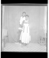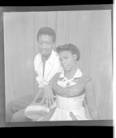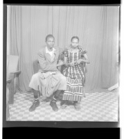 A man wearing a jacket and large shorts sitting face-forward with his arm around the neck of a woman wearing a dress, pagne, and necklace sitting face-forward in the studio.