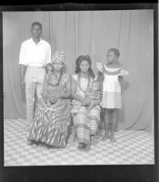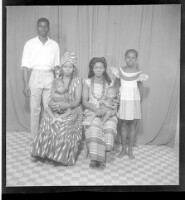A family photo of six people: two women sitting with two babies, a little girl standing, and a young man wearing a white shirt and pants standing in the studio.