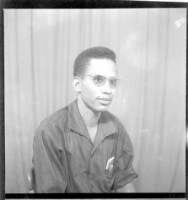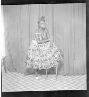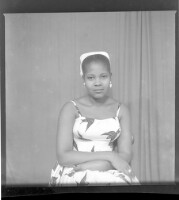 A woman wearing a dress, a head wrap, earrings, and a ring sitting on a chair with her arms crossed face-forward in the studio.