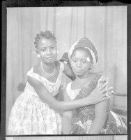 Two young women sitting in chairs, one wearing a white dress, earrings, and a white necklace with her hair styled and her arms around the other wearing a dress and head wrap, both face-forward in the studio.