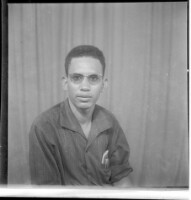 A man wearing a black long-sleeved shirt and glasses with two pens and a piece of paper in his pocket sitting in profile in the studio.