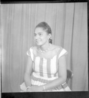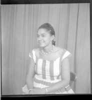 A woman wearing a black and white dress, a necklace, and earrings with her hair styled, smiling and sitting in profile in the studio.