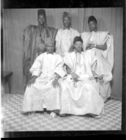 Five men wearing large boubous, one black and the rest white, and black caps; three stand behind the other two, one in front with a traditional guitar, all face-forward in the studio.