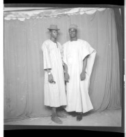 Full portrait of a couple, a man standing wearing a white and blue boubou and a black fez, with a woman sitting, wearing a tussu dress, a loincloth skirt, a light white boubou, and a headscarf, facing forward