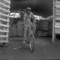 216. EAP054/1/132/264 Reference (shelfmark): EAP054/1/132/264 Title: Recreational photograph [c 1980] Scope & Content: Man on a bicycle at the gates of a warehouse Format of original: 59mm x 59mm plastic negative Collection Area: Endangered Archives Programme Languages: Not applicable Date Range: c 1980 Extent: 1 TIFF image