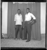 Two young men standing, the one on the right wearing a white long-sleeved shirt and black pants and the one on the left wearing a white shirt, a watch, black pants, and black shoes, both face-forward in the studio.
