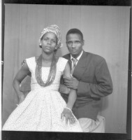 A woman wearing a dress, earrings, a bracelet, a ring, and a necklace sitting with a little girl wearing a dress, head wrap, and earrings standing, both face-forward in the studio.