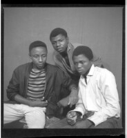 Three young men standing face-forward; the one on the right wearing a black and white t-shirt, a black jacket, and white pants, the one in the middle wearing a grey shirt, and the one on the left wearing a white long-sleeved shirt in the studio.