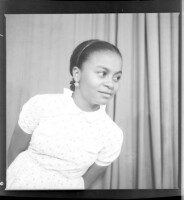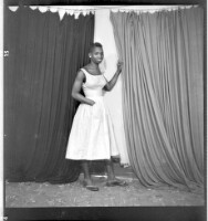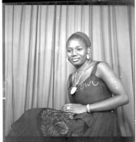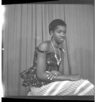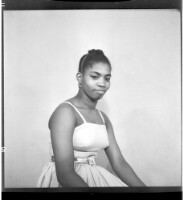 A young girl wearing a camisole, black pagne, a black head wrap, a necklace, a watch, and earrings with her hair styled sitting in profile with her arms and legs crossed in the studio.
