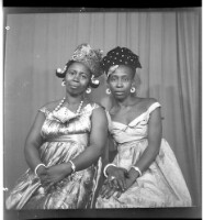Two women sitting face-forward, the one on the right wearing a grey dress, a watch, a ring, a bracelet, earrings, a head wrap, a necklace, and a Touroukalla headdress with her arms crossed, and the other wearing a white dress, a black head wrap, a watch,