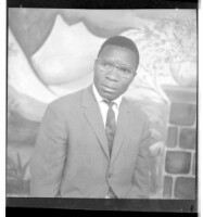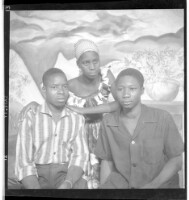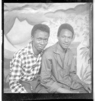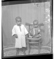 A little boy wearing a boubou standing in profile next to another wearing a boubou sitting face-forward on a chair in the studio.