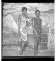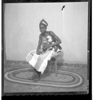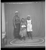 A woman wearing a dress, head wrap, and necklace holding a child on her lap sitting in profile in between a woman wearing a dress, pagnes, head wrap, and necklace standing face-forward and a girl wearing a dress and head wrap standing face-forward in the