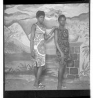 Two girls wearing dresses, one posing with her arm around the other in a studio decorated with clouds, flowers, and a flower pot on a little wall.