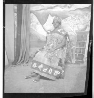 A woman wearing a dress, head wrap, and necklace sitting in profile in a studio decorated with clouds, flowers, and a flower pot on a little wall.
