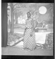 A girl wearing a dress, pagne, and head wrap standing in profile in a studio decorated with a sun rising on a mosque and some surrounding trees.
