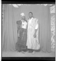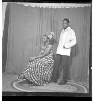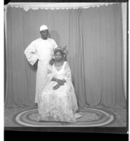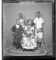 A woman wearing a dress, pagne, head wrap, and necklace holding a child on her lap and sitting face-forward in between two boys, one wearing a boubou and the other wearing a t-shirt and shorts standing face-forward' all in front of a man wearing a shirt a