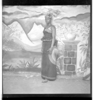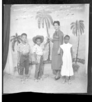 A woman wearing a shirt and skirt standing in profile in between two boys wearing shirts and pants, one wearing a hat, and a little girl wearing a dress and head wrap, all standing face-forward in a studio decorate with three palm trees and some birds fly