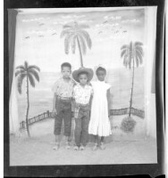 Two boys wearing shirts and pants, one wearing a hat, and a little girl wearing a dress and head wrap standing face-forward in a studio decorated with three palm trees and some birds flying over a body of water.