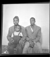 Two men wearing jackets, one wearing a hat and pants holding a little boy on his lap and the other wearing large pants, both sitting, one face-forward and one in profile, in the studio.