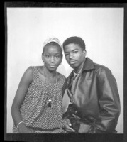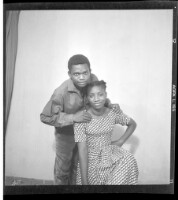 A man wearing a shirt, jacket, and pants standing in profile with his arm around a girl wearing a dress, pagne, and glasses sitting face-forward in the studio.