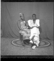 A woman wearing a dress, head wrap, and necklace sitting in profile in front of two men wearing suits and ties, both standing in profile in the studio.